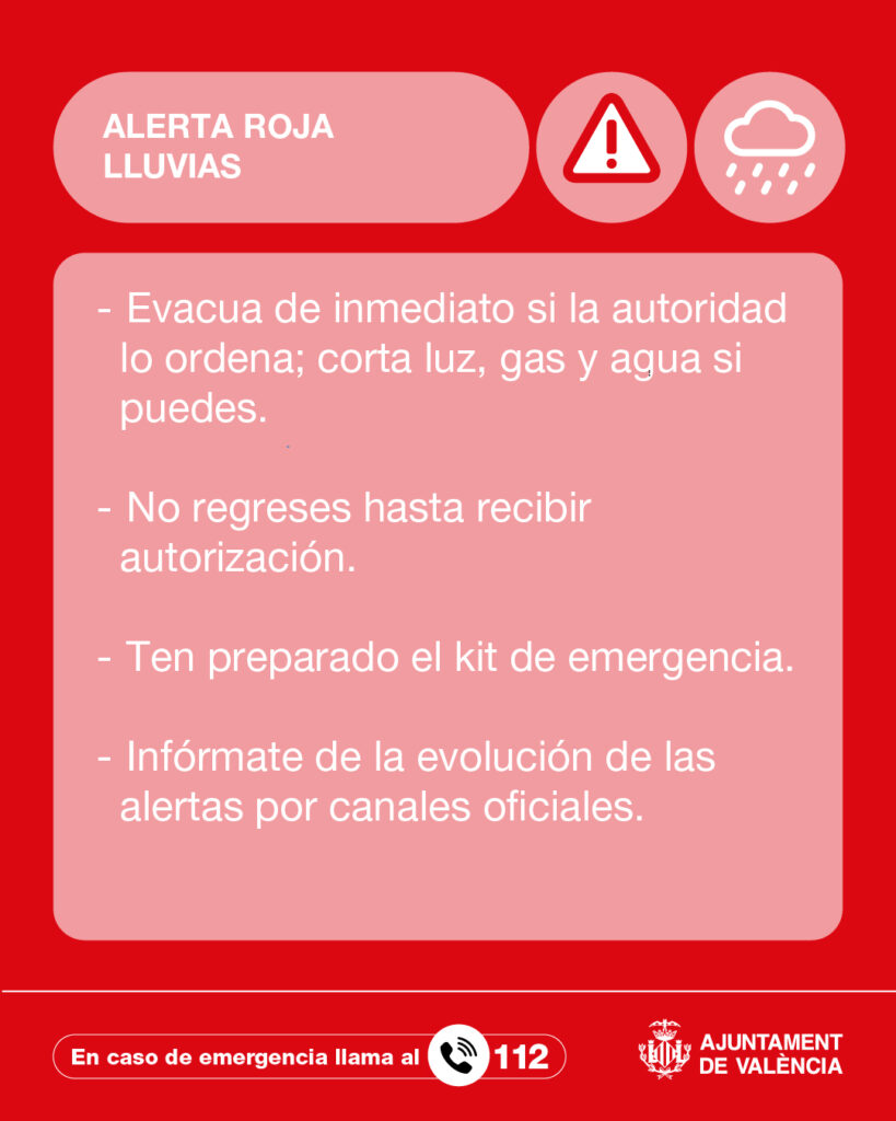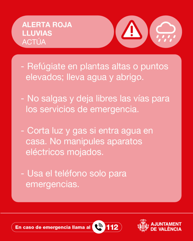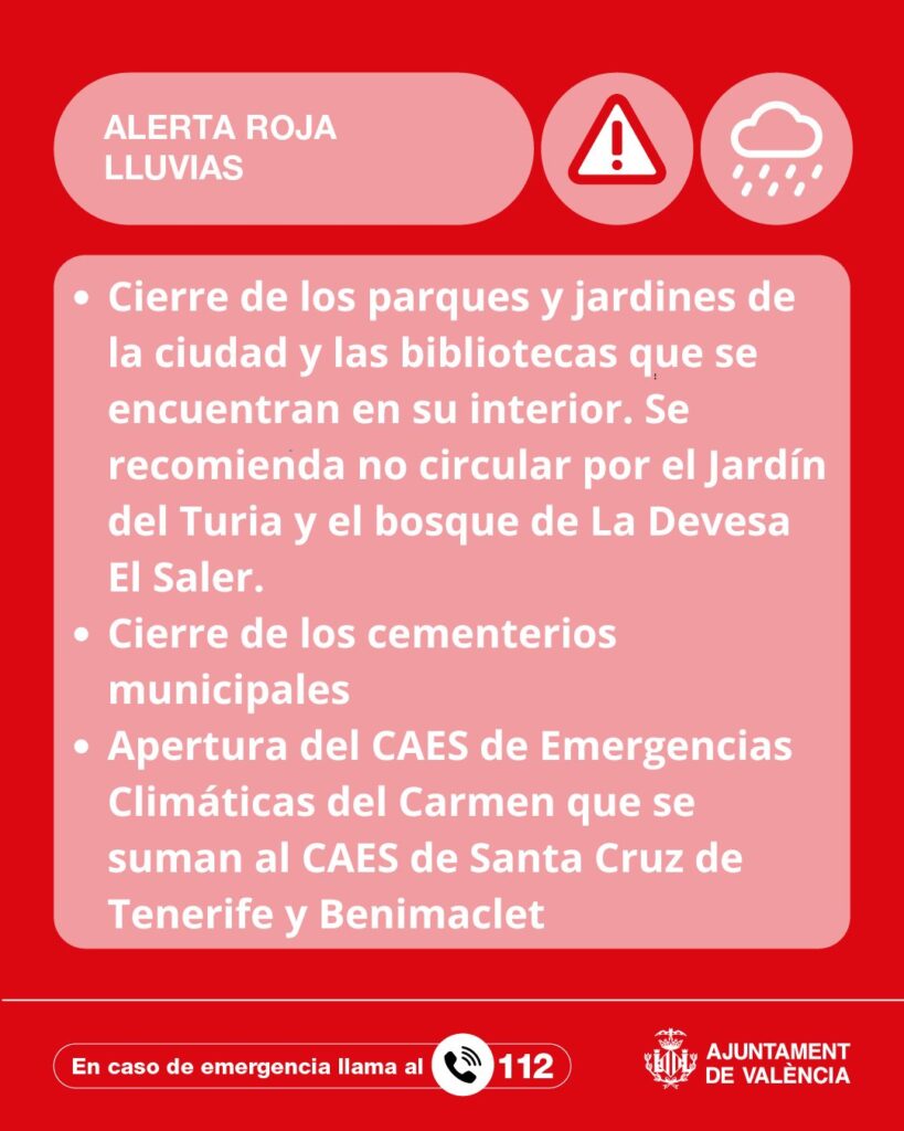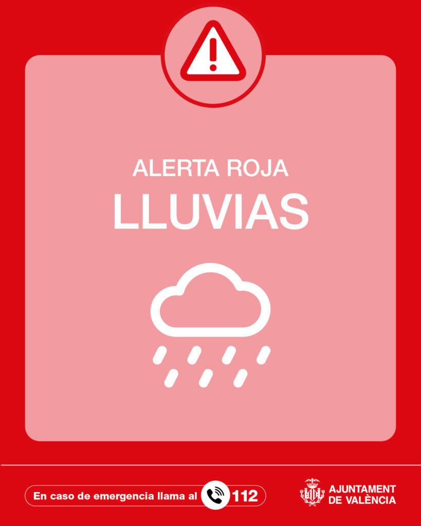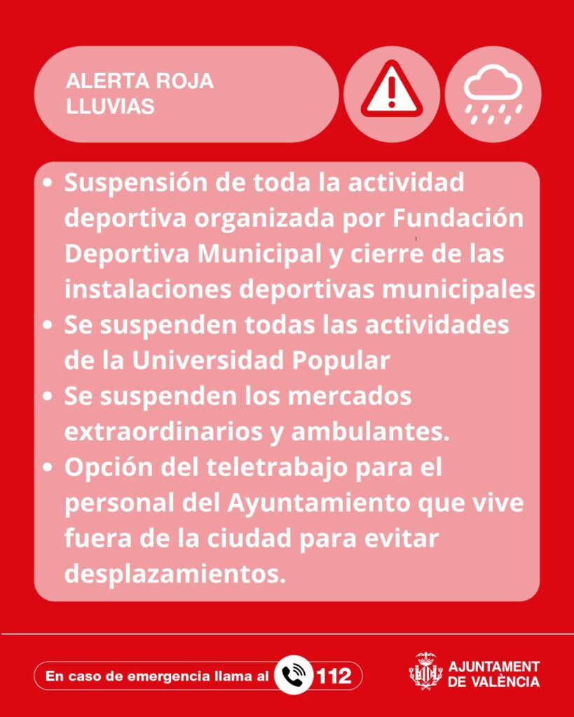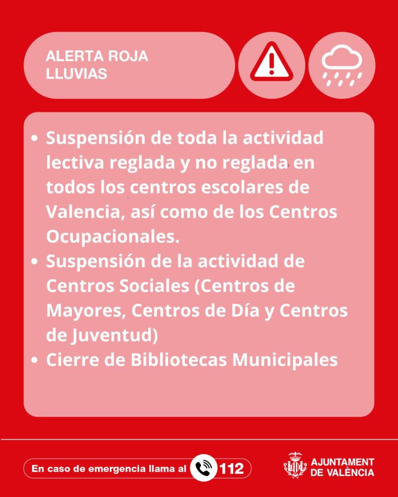 Ante la alerta roja por lluvias y amarilla por tormentas activadas por @GVA112 para el lunes, 29 de septiembre de 2025, el Ayuntamiento de Valencia ha adoptado entre otras medidas la suspensión de todas las actividades de la Universidad popular de València.