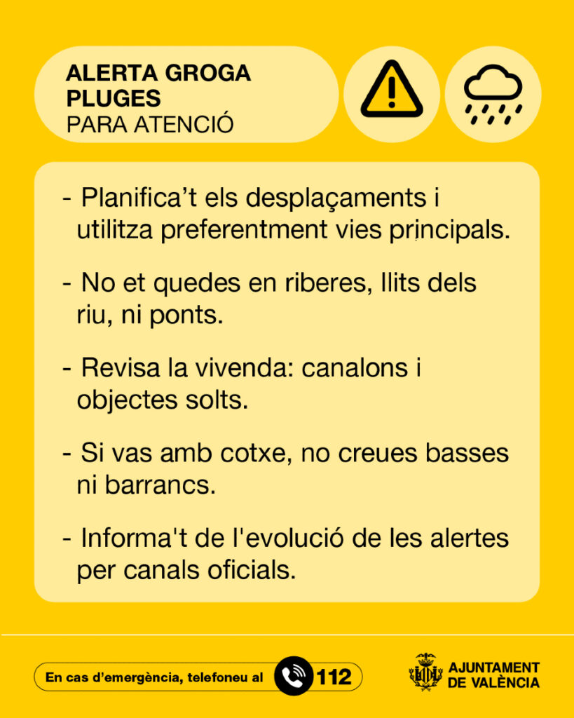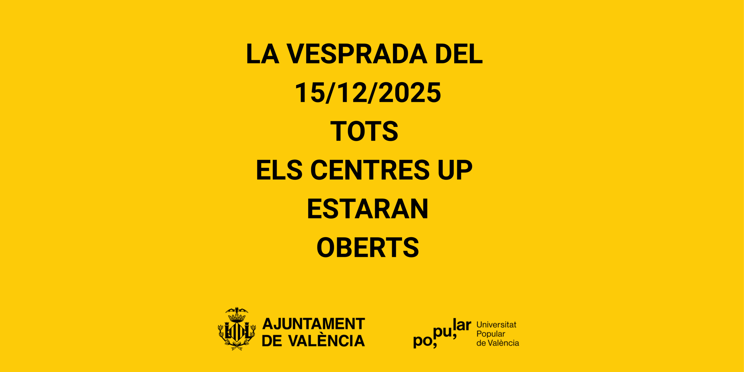 La Universitat Popular de València reprén esta vesprada del dilluns 15/12/2025 les classes en #tots els centres d'#UPValència que estan tancats este matí. Amb l'establiment per a hui, 15 de desembre, de l'alerta groga, els 8 centres UP situats en zona inundable, zona dana o amb perillositat, que han cancel·lat les seues classes i activitats socioculturals el 15/12 al matí, #obriran a la vesprada.